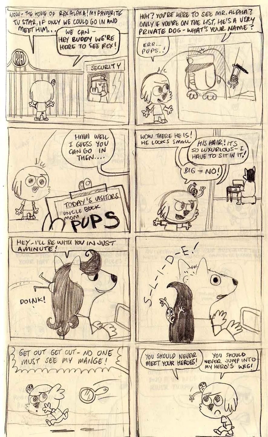 Pups name suits him too, he’s quite small for a dog his age and as a result not everyone takes him seriously and bullies tend to pick on him. However, since having Big around (to help him with his flea powers), Pups has surprised a lot of people with his daring and athleticism, though no one suspects its Big doing the work.